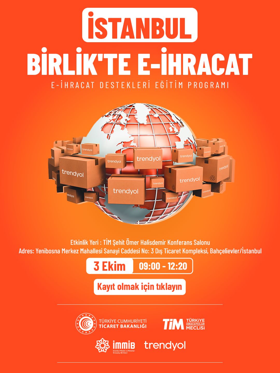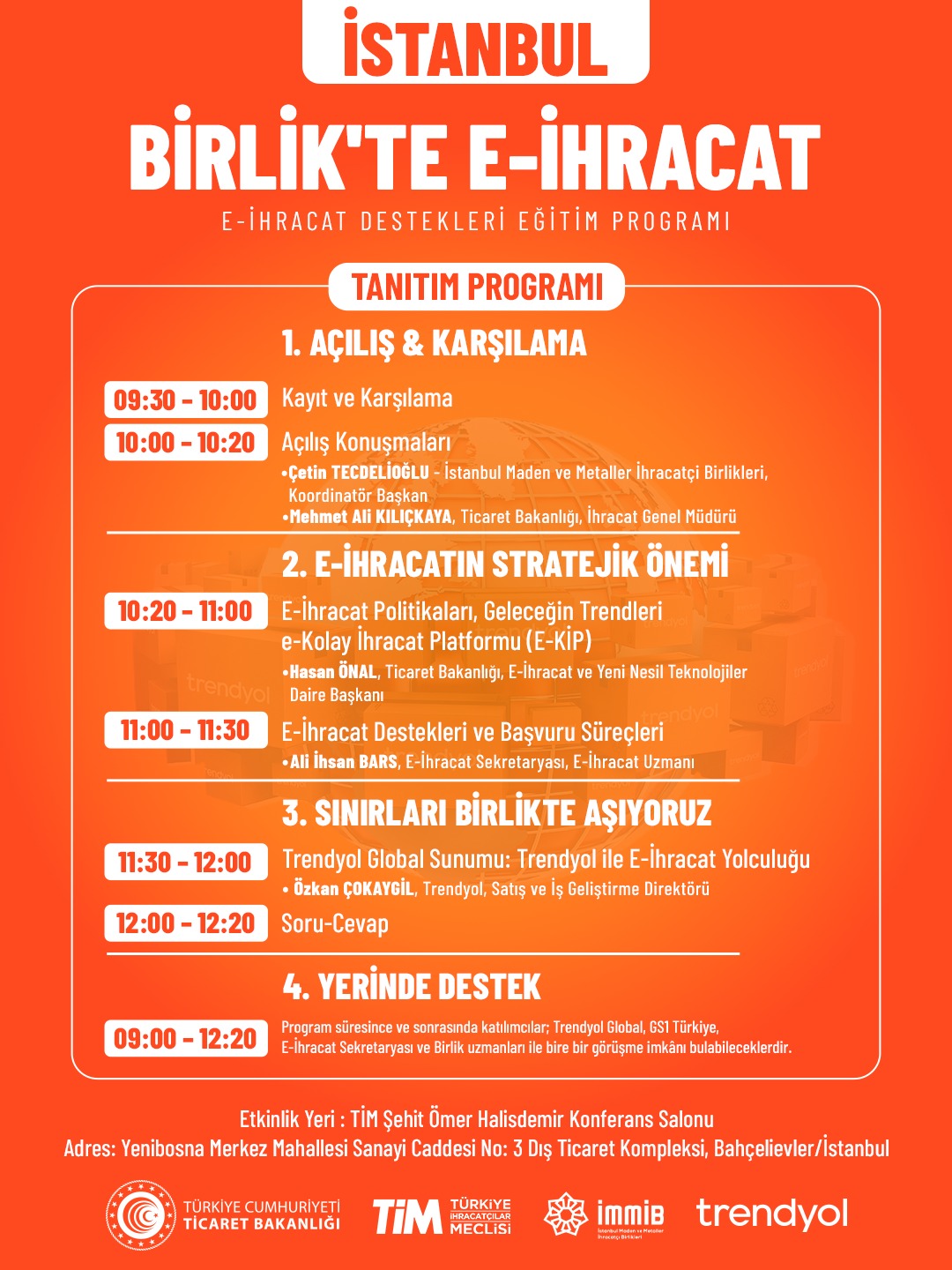 T.C. Ticaret Bakanlığı koordinasyonu, Türkiye İhracatçılar Meclisi ve İstanbul Maden ve Metaller İhracatçı Birlikleri (İMMİB) organizasyonunda, Trendyol Group iş birliğiyle 3 Ekim 2025, Cuma günü İstanbul'da İMMİB ev sahipliğinde “BİRLİK'TE E-İHRACAT” Eğitim Programı gerçekleştirilecektir.