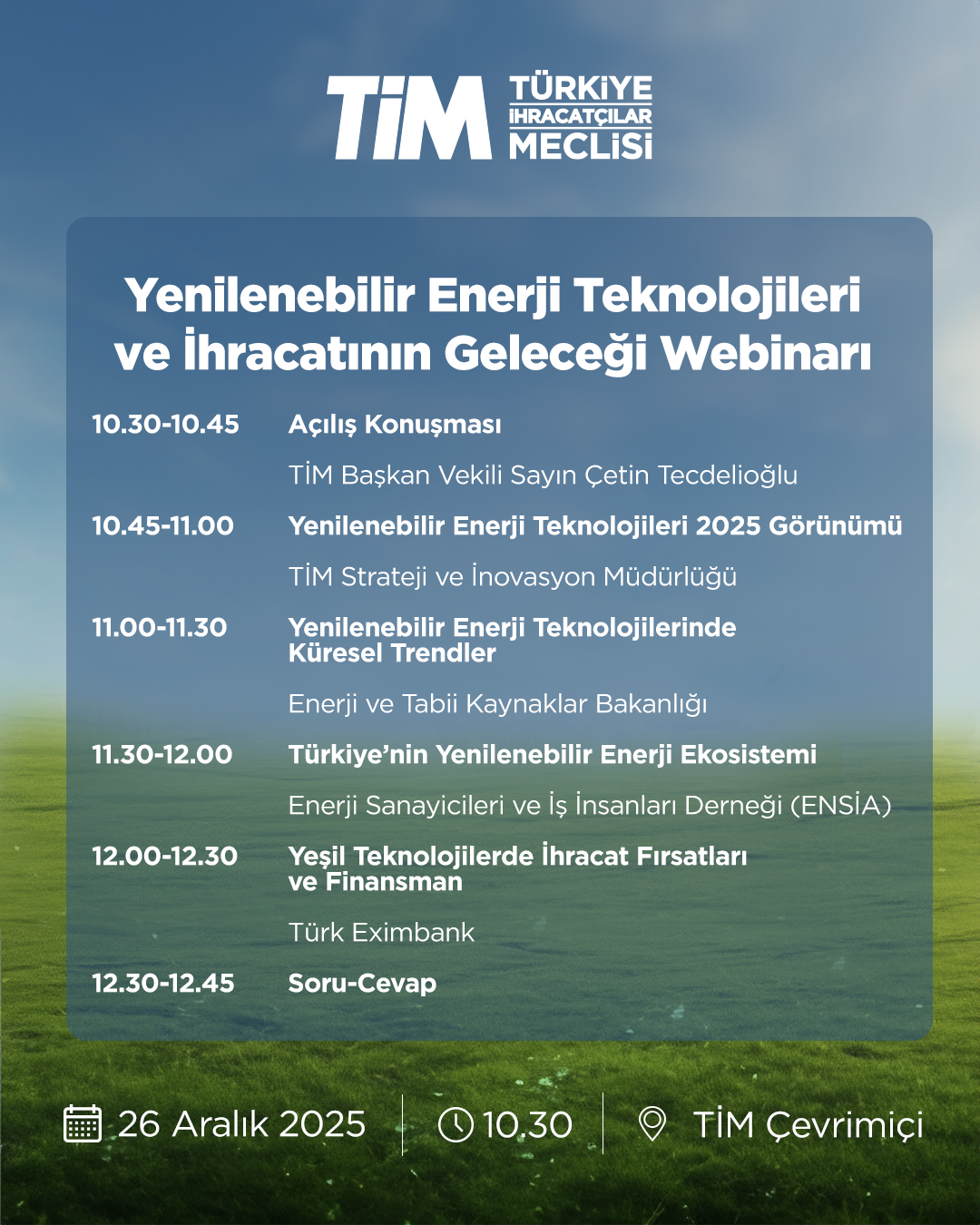 Bu doğrultuda, kamu kurumları, sektör temsilcileri ve finans kuruluşlarının katılımlarıyla çevrimiçi toplantılar gerçekleştirilmesi planlanmaktadır. Bu kapsamda, “Yenilenebilir Enerji Teknolojileri ve İhracatının Geleceği” başlıklı programın, 26 Aralık 2025 Cuma günü saat 10.30'da çevrimiçi olarak düzenlenmesi öngörülmektedir.